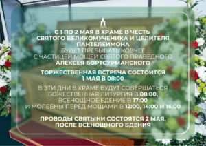 С 1 по 2 мая в храме в честь святого великомученика и целителя Пантелеимона будет пребывать ковчег с частицей мощей святого праведного Алексея Бортсурманского.