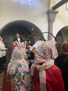 Экскурсию для юных гостей провёл куратор по миссионерской работе Приокского благочиния Дмитрий Строганов. Ребята посетили центральный храм благочиния, где познакомились с неовизантийским стилем архитектуры, узнали его историю и эклектичный характер, особенности киотной росписи, алтарь в виде кувуклии, готичные хоросы и прочими элементами стилизации. Школьники поставили свечи и приложились к ковчегу с частицей ризы Пресвятой Богородицы