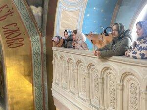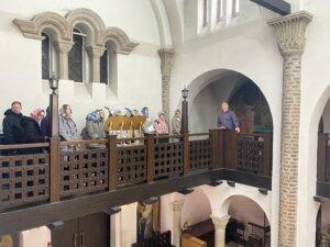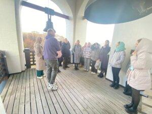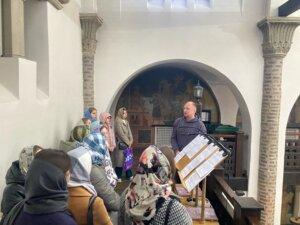 После прохождения по традиционному маршруту по храмовому комплексу, включавшему изучение внутреннего убранства храма, а также подъём на клиросы и колокольню, студенты задали ряд вопросов о церковных таинствах, канонах и церковных традициях. Дмитрий Строганов рассказал гостям о том, какие обязанности имеют крёстные родители, как появилось таинство венчания, какие правила и канонические постановления регламентируют брачную жизнь.