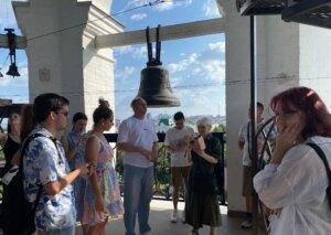 Руководитель миссионерского отдела Нижегородской епархии протоиерей Дмитрий Мартынов и специалист епархиального Отдела по взаимодействию с высшей школой Дмитрий Строганов встретили группу гостей у колокольни Спасо-Преображенского собора. После небольшой исторической справки и знакомством с житием основателя Нижнего Новгорода святого благоверного князя Георгия Всеволодовича иностранные студенты осмотрели прекрасные виды города и услышали работу профессионального звонаря.