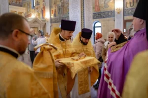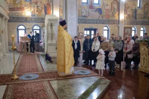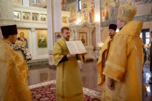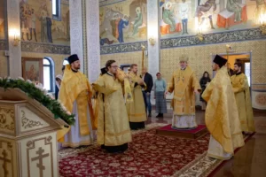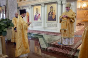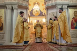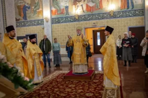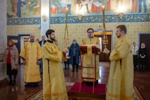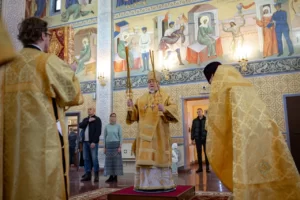 Его Преосвященству сослужили исполняющий обязанности благочинного иерей Олег Карсаков, настоятель этого храма иерей Антоний Требухин, протоиерей Александр Литвиненко и клирик благочиния диакон Александр Панкратов.
