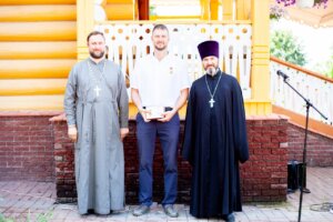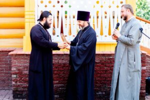 Благочинный Приокского округа иерей Владимир Панин поздравил сотрудников храма и музея и вручил памятные награды, посвященные 350-летию Нижегородской епархии. Отец Виталий и отец Василий в свою очередь поздравили отца Владимира с именинами и подарили икону святого равноапостольного князя Владимира.