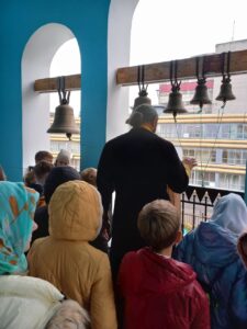 Дети в сопровождении священника поднялись на колокольню, где все желающие могли позвонить в колокола.