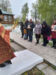 В деревне Мордвинцево панихиду совершил клирик храма в честь иконы Божией Матери «Взыскание погибших» иерей Алексий Лушенков. Жители деревни вместе с батюшкой украсили памятник погибшим цветами и венками.