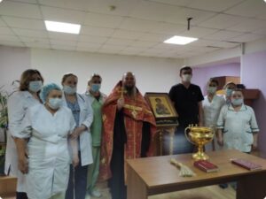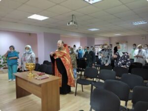 По просьбе руководителя онкологического стационара Алексея Казакова в больницу из главного центрального храма Приокского благочиния была принесена икона с частицей святых мощей великомученика и целителя Пантелеимона. Священнослужитель совершил молебен перед иконой и благословил собравшихся.