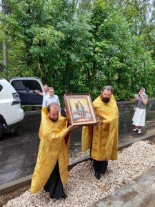 Образ святого благоверного князя Георгия Всеволодовича встретили и освятили благочинный Приокского округа иерей Олег Карсаков и настоятель строящегося храма иерей Роман Татаринов.