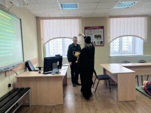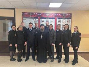 Священнослужитель совершил молебен, освятил помещения и учебные классы и провёл с офицерами полиции беседу на тему «Грех – причина преступления, покаяние – начало исправления». Обсуждение затронуло поле профессиональной деятельности правоохранителей и большинство вопросов было связано с тем, как православная вера помогает людям, совершившим преступление, осознать свою вину и сделать шаг к изменению жизни.