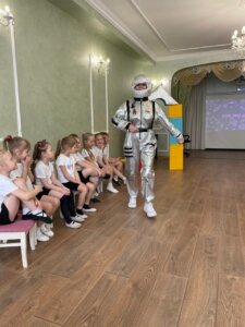 Дети состязались в ловкости и выносливости в эстафетах, играли, отгадывали загадки. Через специальный «телепортатор» ребята переместились на космодром, где их уже ждал журналист, который взял интервью о космосе и нашей планете, дети без затруднений ответили на все вопросы. Космонавт пригласил ребят в космическое путешествие. Дети побывали на Луне, отгадывали загадки от инопланетянина Вертунчика на планете Альфа Центавра, собирали букеты на планете Цветов, затем вернулись на планету Земля.