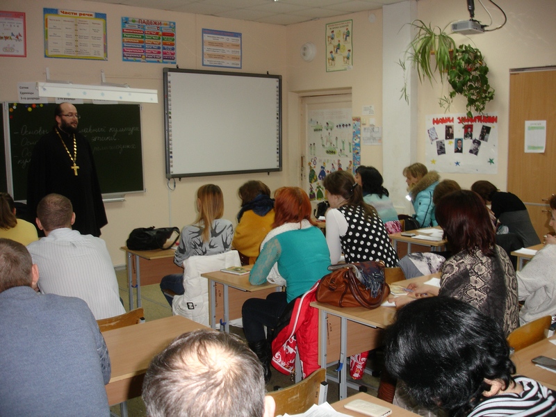 Для ознакомления с предметом «Основы православной культуры» 10 марта в МБОУ СОШ №135 были приглашены на встречу с родителями представители Приокского благочиния священник Сергий Сподинов и помощник благочинного по образованию Ольга Михайловна Разина.В своём выступлении отец Сергий говорил о том, что «Основы православной культуры» – самостоятельный учебный предмет, имеющий особые образовательные и воспитательные задачи. Он направлен на приобщение наших детей к культуре великой России. Приобщиться к мировой культуре и обогатиться ею можно только укореняясь в традициях своего народа. Мы призваны воспитывать граждан России, которые чтут память своих великих предков. Изучение основ православной культуры – это начало приобщения ребёнка к нравственным и культурным ценностям своего народа, хранимым Русской Православной Церковью.